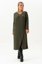 Платье женское длиной до середины икры, слегка расклешенное к низу. Спинка с косым передом в области талии и средним швом до разреза. Перед с косым подрезом в области талии, образующий мягкую складку  из лифа и 1 глубокую складку от подреза вниз. Горловина с рубашечным воротником на стойке и драпировкой в виде качели. Рукав втачной с отложными манжетами.