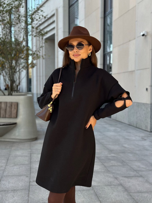 Платье прямого силуэта, немного выше линии колена. Платье со спущенной линией плечевого шва. Спинка со средним швом.