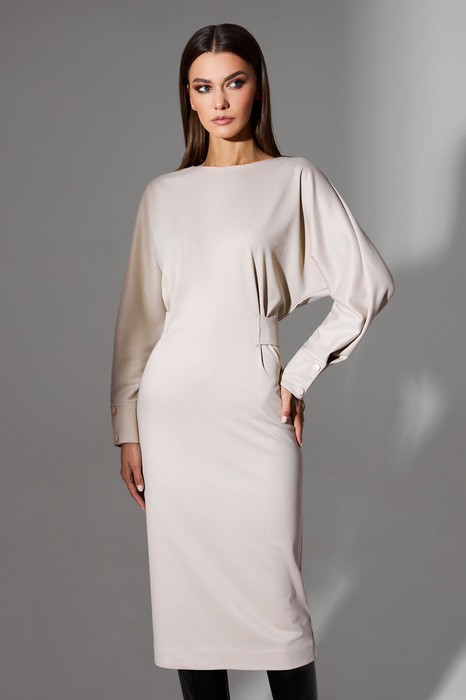 Платье женское из трикотажного полотна полуприлегающего силуэта. Рукава цельнокроеные по низу с притачной манжетой застегивающийся на пробивную кнопку окрашенную в тон ткани. В среднем шве спинки обработана потайная молния, по низу обработана шлица. Горловина круглая. По полочке на уровне талии прикреплен пояс формирующий складки, застегивающийся на спинке с возможностью регулировки пробивными кнопками.