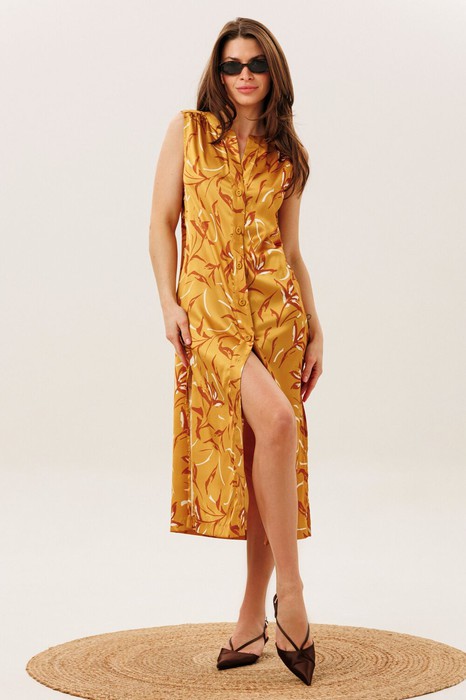 Платье женское приталенного силуэта со сьемным поясом из основной ткани. По спинке кокетка. Воротник - стойка. По переду притачные планки. В боковых швах разрезы до середины бедра. Застежка на пробивные петли и притачные пуговицы.