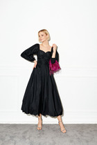 Платье женское, прямого силуэта. Вырез горловины по переду - "лодочка", по спинке V - образный. По переду рельеф, заканчивающийся разрезом, и волан, переходящий в горловину спинки. Волан обтачен тканью-компаньоном. В боковых швах карманы.