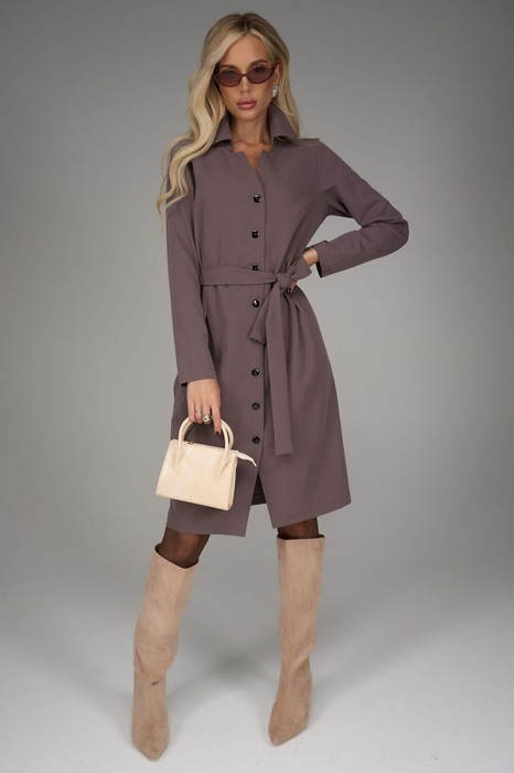 Элегантное платье-рубашка миди длины с акцентом на талию. Прямой силуэт корректируется поясом, создавая женственный образ. Классический отложной воротник и планка с пуговицами добавляют образу строгости и утончённости.