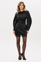 Платье выполнено из плотного атласа. Платье полуприлегающего силуэта длиной выше линии колена. Застежка на потайную молнию сзади в среднем шве спинки. Горловина округлой формы. Рукав двухшовный, фигурной формы. Низ платья декорирован кружевом. Платье на притачной по низу подкладке. В комплект входит съемный ремень из основной ткани с обтяжной пряжкой и блочками.