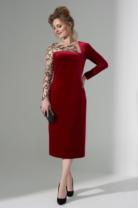 Платье женское  выполнено из велюра и прозрачной сетки. Изделие прилегающего силуэта. По горловине выполнен ассиметричный вырез со вставкой из сетки . На сетке по горловине и рукаву вышивка. Рукав втачной длинный, зауженный к низу. Длина рукава 55-57см.