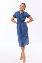 Платье полуприталенного кроя, выполнено в романтичном стиле из плательной тонкой ткани, верх  изделия полуприлегающий декорирован накладными карманами с клапанами. Юбка расклешенная (полусолнце), по боковым юбки карманы декорированы клапанами. Изделие дополнено съемным поясом. Застежка- планка с кнопками.