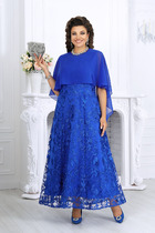 Вечернее женское платье выполнена из эластичной сетки с люрексной нитью, изделие длины - макси, отрезное по линии талии, с регулирующей эластичной тесьмой в таллиевом шве. По лифу в плечевые швы заложены глубокие складки, декольте прикрыто основной тканью. Горловина округлая, рукав - втачной, длинный, разрезной, по низу рукава манжета с петлей-пуговицей. По центру спинки разрез и декоративные складки от плеча. Юбка платья прямая с высоким разрезом от низа выше уровня колена.