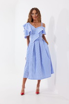 Платье красивое легкое женское нарядное повседневное выполнено из хорошего шифонаполуприлегающего силуэта на подкладке. Вырез горловины округлый на обтачке, что придает комфорт в носке. Рукав легкий "крыло" со сборкой по окату. Низ платья ассиметричный с воланами - изюминка изделия. Декором платья служит дизайн самой ткани.