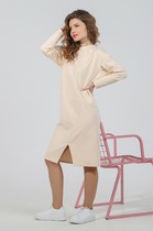 Платье женское нарядное полуприлегающего силуэта расширенное к низу. Выполненео из плательной ткани в сочетании с отделкой. Вырез горловины круглый обработан косой бейкой, рукав втачной по низу собран на притачной резинке. По переду платье отрезное по линии груди, верх отрезная фигурная кокетка из отделочной ткани, по спинке потайная тесьма молния. Декором платья служит кокетка из отделочной ткани по переду платья.
