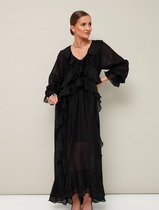 Платье женское полуприлегающего силуэта выполнено из плательной ткани с мерцающим пропитанным блеском (не сыпется) в сочетании с шифоном. Вырез горловины круглый на обтачке, по полочке нагрудные втачки, рукав втачной из шифона 7/8 по низу на сборке и притачной манжете. По спинке потайная тесьма - молния и вытачки.Декором платья служит декоративный пришивной элемент со съемной брошью.