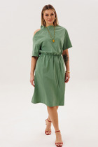 Платье элегантное красивое женское нарядное повседневное полуприлегающего силуэта расширенное к низу. Выполнено из хорошего красивого однотонного хлопка в сочетании с шитьем. Вырез горловины фигурный, что придает изделию "изюминку" воротник на стойке рубашечного типа. Рукав из шикарного шитья, что делает элемент воздешным и легким. Платье отрезное по талии. Юбка ассиметричная с застежкой доверху на обметанные петли и пуговицы. По низу юбки притачной волан из шикарного шитья, в боковых швах обработаны карманы. Декором платья служит дизайн ткани, съемный пояс из основной ткани и отделочные пуговицы.