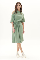 Свободный А-образный силуэт, рубашечный покрой, ассиметричная горловина, изысканный открытый участок плеча, эластичная тесьма по линии талии, съёмный пояс на полукольцах.