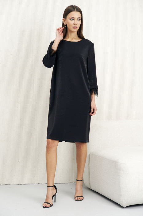 Элегантное платье прекрасно подчеркнёт Ваш стиль и красоту. Лаконичный дизайн и упрямлённый силуэт и круглый вырез горловины – особый шарм данной модели. Платье выполнено из полотна отличного качества. Главная изюминка данной модели – лента из натуральных страусиных перьев по рукавам, которую при желании легко можно отстегнуть. Длина рукава ок. 50 см. Длина платья по спинке ок.94 см.