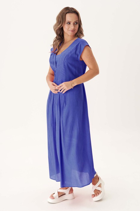 Свободный А-силуэт с заниженной линией плеча, V-образный глубокий вырез со вставкой. Полочка со средним швом и складками-защипами ниже уровня талии. По складкам - фиксирующие декоративные строчки. Спинка со средним швом. В боковые швы вставлен пояс, который подчёркивает линию талии, завершая образ.