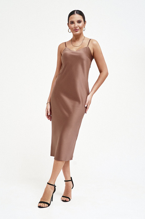 Платье - миди прилегающего силуэта выполнено из струящегося шелк - сатина, на регулируемых бретелях.