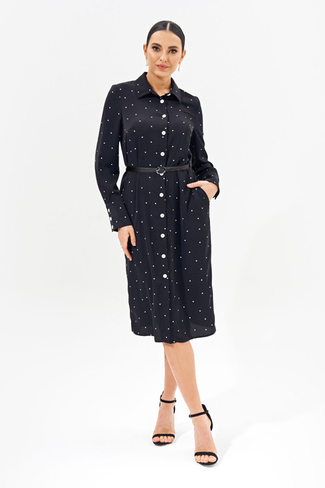 Классическое женское платье -рубашка  полуприлегающего силуэта выполнено из легкой струящейся ткани. Изделие со втачными рукавами и высокой акцентной манжетой, рубашечным воротником, карманами в боковых швах, застежкой на петли и пуговицы.