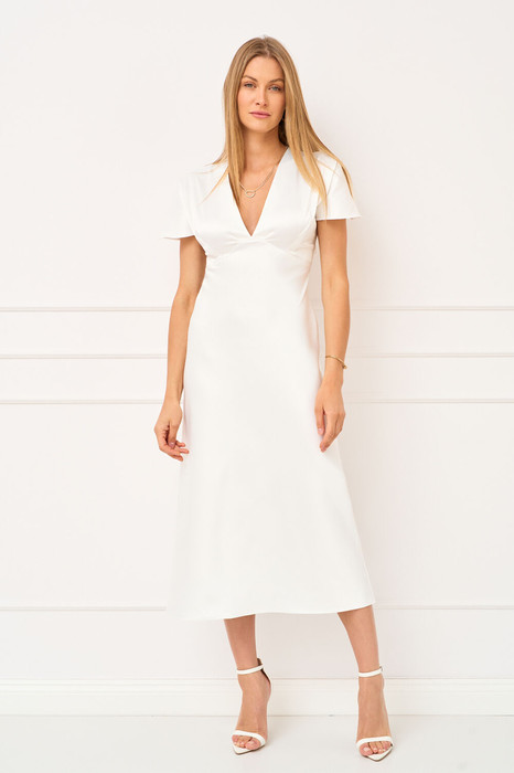 Женское платье полуприлегающего силуэта выполнено из плотного сатина с подрезами и складками, расположенными под линией груди. Рукава цельнокроеные; горловина имеет v -образную форму; в боковом шве - молния.