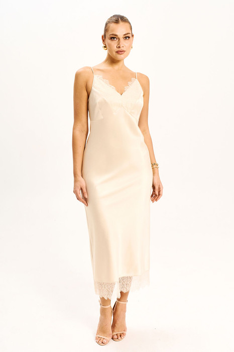 Платье - миди прилегающего силуэта выполнено из струящегося шелк - сатина на регулируемых бретелях и молнией в боковом шве. Подрезы по линии груди и низу платья дополнены мягким французким кружевом, которое держит форму. Платье полностью соответствует заявленному размеру. Пожалуйста, пользуйтесь таблицей замеров готового изделия, чтобы подобрать идеальный размер.