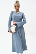 Платье женское трикотажное, полуприлегающего силуэта.По переду рельефе обработан разрез. Спинка с рельефами идущими от плеча и выточками по линии талии. Горловина лодочка. Рукав 3/4 со спущенной линией плеча.