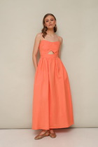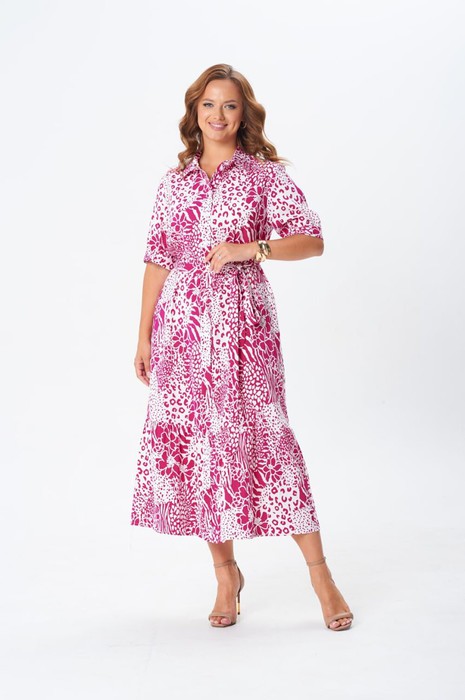 Платье А-образного силуэта выполнено из вискозной ткани с летним принтом. Платье с рубашечным воротником и центральной застежкой на петли и пуговиц. Перед с нагрудной вытачкой. Рукав втачной одношовный с притачной манжетой на петлю и пуговицу. По линии притачивания - сборка. По низу платья притачан волан со сборкой. К платью прилагается съемный пояс из основной ткани. Длина платья по спинке- 127 см, длина рукава- 29 см.