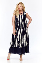 Платье А-образного силуэта выполнено из вискозной ткани с летним принтом. Платье с рубашечным воротником и центральной застежкой на  петли и пуговиц. Перед с нагрудной вытачкой. Рукав втачной одношовный с притачной манжетой на петлю и пуговицу. По линии притачивания - сборка. По низу платья притачан волан со сборкой. К платью прилагается съемный пояс из основной ткани. Длина платья по спинке- 127 см, длина рукава- 29 см.