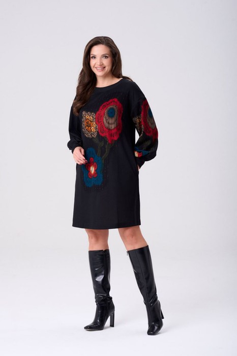 Платье свободного силуэта из трикотажной ткани с принтом. Рукав втачной одношовный со складками по низу и манжетой. В боковых швах карманы. Горловина обработана планкой в форме лодочки. По переду и по левому рукаву поверх принта настрочена сетка. Сетка может быть заменена с сохранением художественного образа изделия. Длина платья - 93 см , длина рукава платья - 53 см.