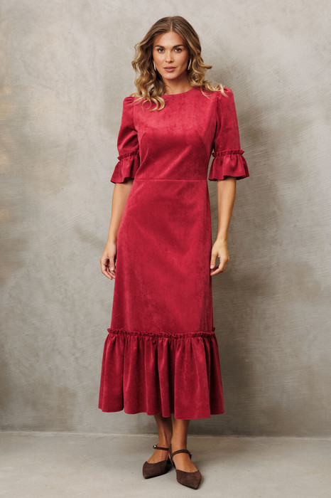 Платье приталенного силуэта отрезное по линии талии из мягкой вельветовой ткани. Верхняя часть переда с нагрудной вытачкой. Спинка со средним швом и потайной молнией. Рукав втачной со сборкой по окату. По  низу рукава и по низу изделия волан. Длина платья -  125 см, длина рукава - 40 см.