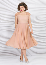 Платье, с застежкой на потайную молнию по среднему шву спинки, без воротника, с фигурным вырезом горловины. Платье отрезное по линии талии. Нижняя часть платья состоит из двух воланов. Лиф переда с рельефами, выходящими из горловины. Лиф спинки со средним швом, рельефами, выходящими из горловины. Рукав втачной, длинный, с отрезной манжетой. Окат и шов притачивания манжеты присборен. Платье со съемным поясом.