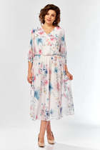 Платье, с центральной двубортной застежкой на пришивные кнопки, с отложным воротником и лацканами. Верхняя часть переда с нагрудными вытачками. Верхняя часть спинки со средним швом и талиевыми вытачками .Нижняя часть переда и спинки расклешенная. Низ переда закладывается в односторонние складки. Шов по талии присборен на резинку. Рукав втачной, короткий, с отложной манжетой. Платье со съемным поясом.
