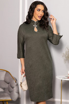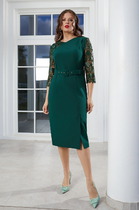 Платье с центральной застежкой на петли и пуговицы, без воротника, без рукавов, на бретелях. Платье отрезное по линии талии. Лиф переда с нагрудными и талиевыми вытачками. Лиф спинки со средним швом, талиевыми вытачками. Нижняя часть переда и спинки расширенная к низу, с двумя односторонними складками по переду и талиевыми вытачками по низу. По нижней части платья вставки из кружева разной ширины.