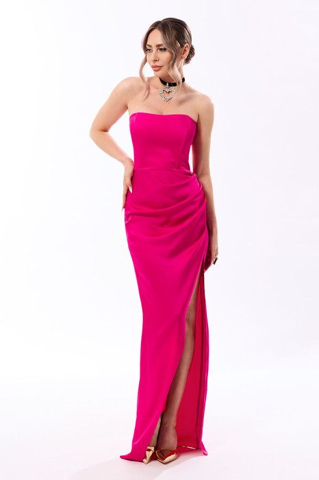 Платье полуприлегающего силуэта, с застежкой на потайную молнию в среднем шве спинки, без воротника, без рукавов, отрезное по линии талии . Лиф переда и спинки с рельефами от верхнего края до талиевого шва, . Спинка со средним швом. Рельефные швы лифа усилены регилином .Нижняя часть переда с двумя асимметричными деталями. Верхняя деталь с четырьмя односторонними складками, выходящими из бокового шва .