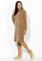 Платье без воротника, с V-образным вырезом горловины, с застежкой на потайную молнию в среднем шве спинки. Платье отрезное по линии талии. По лифу переда с нагрудными и талиевыми вытачками. Спинка со средним швом, по лифу спинки с талиевыми вытачками. Нижняя часть платья расширенная к низу. По низу платья- отрезная кокетка и волан. Рукав втачной, длинный, расширенный к низу.