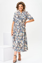 Платье, без воротника, с V-образным вырезом горловины, застежкой на потайную молнию в левом боковом шве. Платье отрезное по линии талии. Лиф переда с деталями на запах, со сборкой по плечевым и нижнему швам. Лиф спинки с частичной сборкой по низу. Рукав длинный, втачной, с отрезной манжетой, присборенной на резинку. Окат рукава со сборкой. Нижняя часть платья с двумя рельефными швами. Нижняя часть спинки со средним швом, двумя рельефными швами.