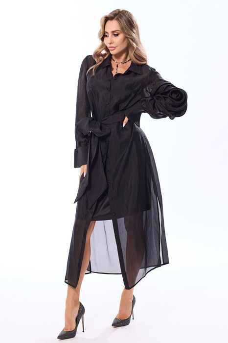 Платье с центральной застежкой на петли и пуговицы, втачным воротником с отрезной стойкой. По переду с клапанами, расположенными на уровне груди. Спинка с отрезной кокеткой. По шву притачивания кокетки- встречная складка. По боковым швам- разрезы. Рукав втачной, длинный, с отрезной манжетой. По левому рукаву отделка- декор в виде розы. Платье двойное. Нижнее платье на бретелях, с нагрудными вытачками по переду.