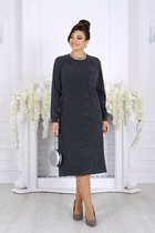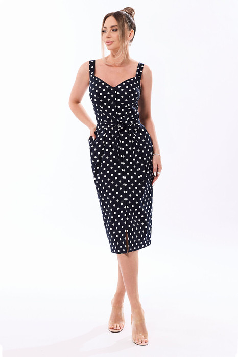 Платье с центральной застежкой на петли и пуговицы, на широких бретелях. Платье отрезное по линии талии. Верхняя часть переда с талиевыми вытачками, нижняя часть переда с карманами и односторонними складками по талии. Нижняя деталь спинки с талиевыми вытачками. Платье со съемным поясом.