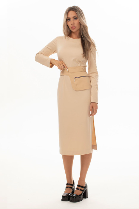 Платье, без воротника, с круглым вырезом горловины, застежкой на потайную молнию в среднем шве спинки. По переду с нагрудными вытачками. Спинка со средним швом, талиевыми вытачками. Правый боковой шов с разрезом. Рукав втачной, длинный. Платье со съемным поясом-сумкой.