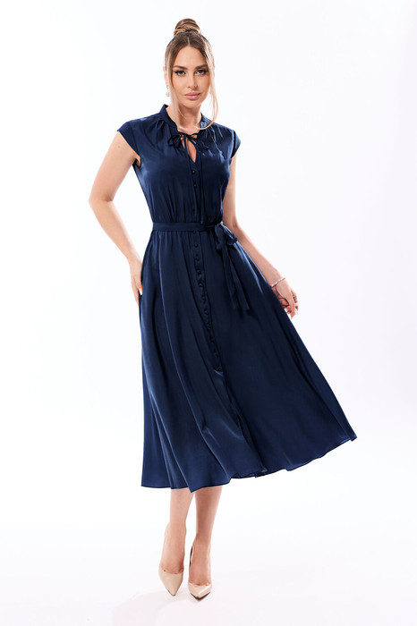 Платье с центральной застежкой на петли и пуговицы, с отрезным воротником- стойкой, рукав- крылышко. Платье отрезное по линии талии. Шов по талии присборен на резинку. По горловине переда- шнур- завязка. В боковых швах расположены карманы. Платье со съемным поясом.