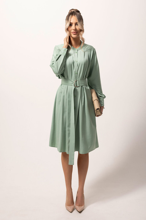 Платье свободного трапециевидного силуэта, с центральной застежкой на петли и пуговицы, с отрезной стойкой. Кокетка платья без плечевого шва. Полочки по шву притачивания кокетки с односторонними складками. Спинка по шву притачивания кокетки с встречной складкой. Платье со съемным поясом. Рукав втачной, длинный, с отрезной манжетой.