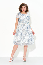 Платье полуприлегающего силуэта, без воротника, с V-образным вырезом горловины, с центральной застежкой на петли и пуговицы по лифу переда. Платье с втачным поясом. По спинке пояс присборен на венгерку. По переду лиф и юбка присборены по шву притачивания к поясу. В боковых швах расположены карманы. Рукав короткий, цельнокроенный. Плечо спущенное, со сборкой. Платье без подкладки.
