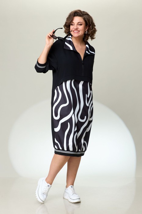 Платье женское свободного силуэта, горловина со стойкой, рукав спущенный 3/4 по низу на декоративной резинке. Изделие комбинированное из двух тканей. По переду декоративная, функциональная застежка на тесьму молнию. По низу платье с декоративной резинкой. Длина рукава – 39см, длина изделия – 108см