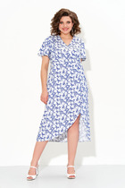 Женское летнее платье полуприлегающего силуэта со втачными рукавами и небольшой сборкой по линии талии выполнено из легкой непросвечивающейся натуральной ткани. Юбка платья на запах с подъюбником из основной ткани. В комплекте съемный пояс.