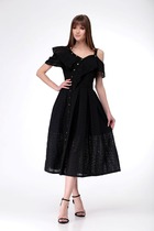 Платье женское полуприлегающего силуэта, по спинке застежка-молния; по низу рукавов декоративные бусины - жемчуг.