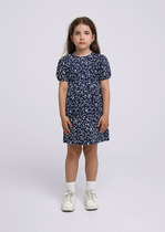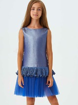 Платье для девочки из футера, свободного силуэта, с длинными втачными рукавами с отверстием для большого пальца. Горловина оформлена широким воротником-"труба". Перед декорирован аппликацией. Низ изделия фигурный.