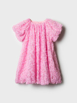 Платье коктейльное для девочки А-образного силуэта, средней длины, с втачными короткими рукавами, круглым вырезом горловины. Застёжка сзади на навесную петлю с пуговицей. Ткань- кружевное полотно на подкладке из кулирного полотна.