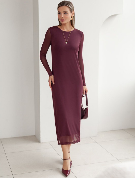 Состав: 95%ПЭ 5%ПУ; ПОДКЛАДКА- 95%Вис 5%ПУ Плотность: 90 Г/м2Роскошная модель в глубоком бордовом цвете из мягкой сетчатой ткани с прозрачными рукавами, придающими образу лёгкую игривость. Мягкая вискозная подкладка обеспечивает комфорт, сохраняя при этом эффект полупрозрачности. Прямой силуэт подчеркивает женственность. Идеально для вечерних выходов и особых случаев.