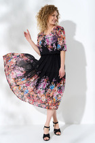 Платье женское прямого силуэта из плательной ткани. По переду нагрудные вытачки. Внизу-печать. По спинке фигурный вырез, складки и печать по центральной детали. В боковых швах карманы и разрезы внизу. Горловина круглой формы. Рукав спущенный с притачной манжетой.