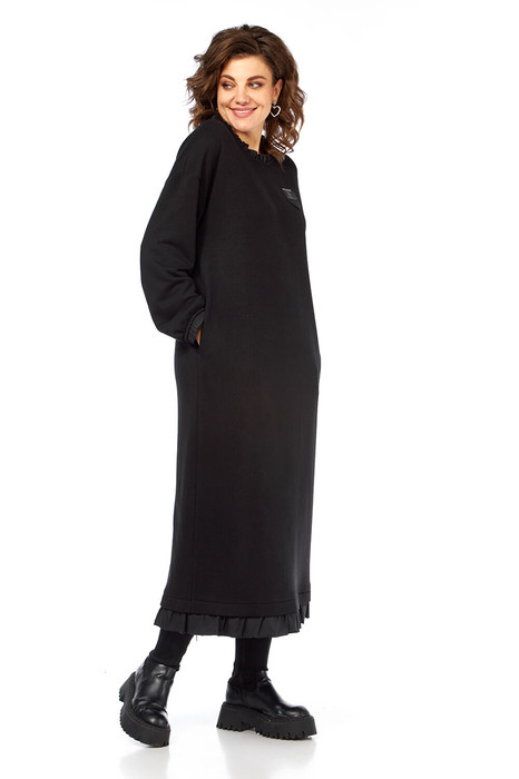 Платье женское прямого силуэта, изготовлено из трикотажного полотна. Рукава спущенные длинные. По горловине, низу рукавов и низу платья обработаны рюши из хлопковой ткани. По переду декоративная нашивка. Спинка со средним швом и разрезом по низу. В боковых швах карманы.