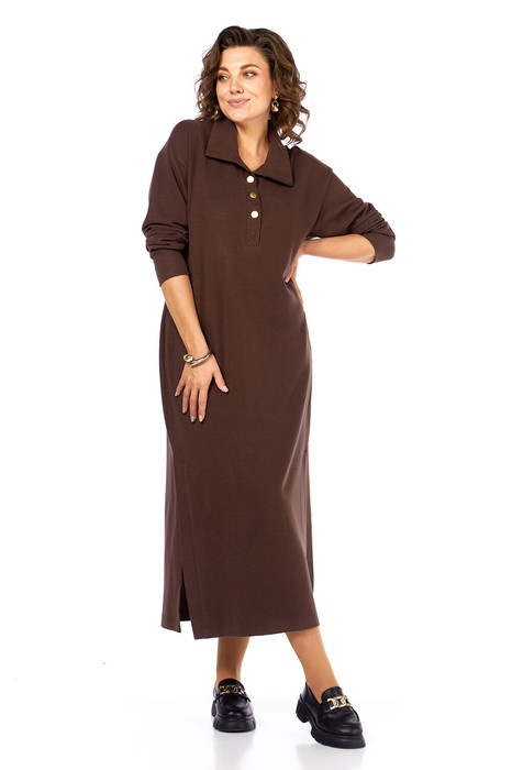 Платье женское прямого силуэта, выполнено из трикотажного полотна. Горловина обработана воротником стойкой, застежка планка на петли и пуговицы. В боковых швах обработаны карманы, по низу шлицы. Рукава спущенные, длинные внизу на манжетах.