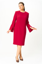 Платье женское прямого силуэта, выполнено из костюмно-плательной ткани. Вырез V-образной формы с отложным воротником. По переду обработан ассиметричный рельеф со шлицей по низу и декоративный клапан на груди. Спинка с кокеткой и средним швом. Рукава втачные, по низу отложные манжеты. Платье дополнено съемным поясом из основной ткани с полукольцами и декоративными пуговицами.