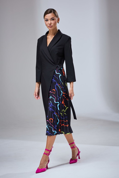 Платье женское из двух видов ткани, полуприлегающего силуэта. Перед комбинированный на запах с поясом. По переду нагрудные и талиевые вытачки. Горловина обработана воротником шалевого типа. Передняя половина юбки выполнена из ткани-компаньона с радиальным гофрированием. В боковом шве справа потайная молния. В области талии слева расположен притачной пояс из основной ткани, завязывающийся на полукольца. Спинка цельнокроеная с плечевыми и талиевыми вытачками. Рукав 7/8 втачной одношовный. Декоративные элементы и фурнитура могут отличаться от заявленных на фото.