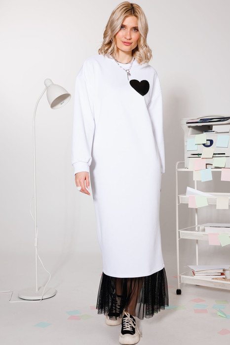 Длинное платье с мерцающей сеткой по низу. Оно идеально подойдет для повседневных образов. По переду дизайнерский принт в виде "штопанного сердца". Выполнено из плотного трикотажногохлопка без начеса. Длина - 134 см.